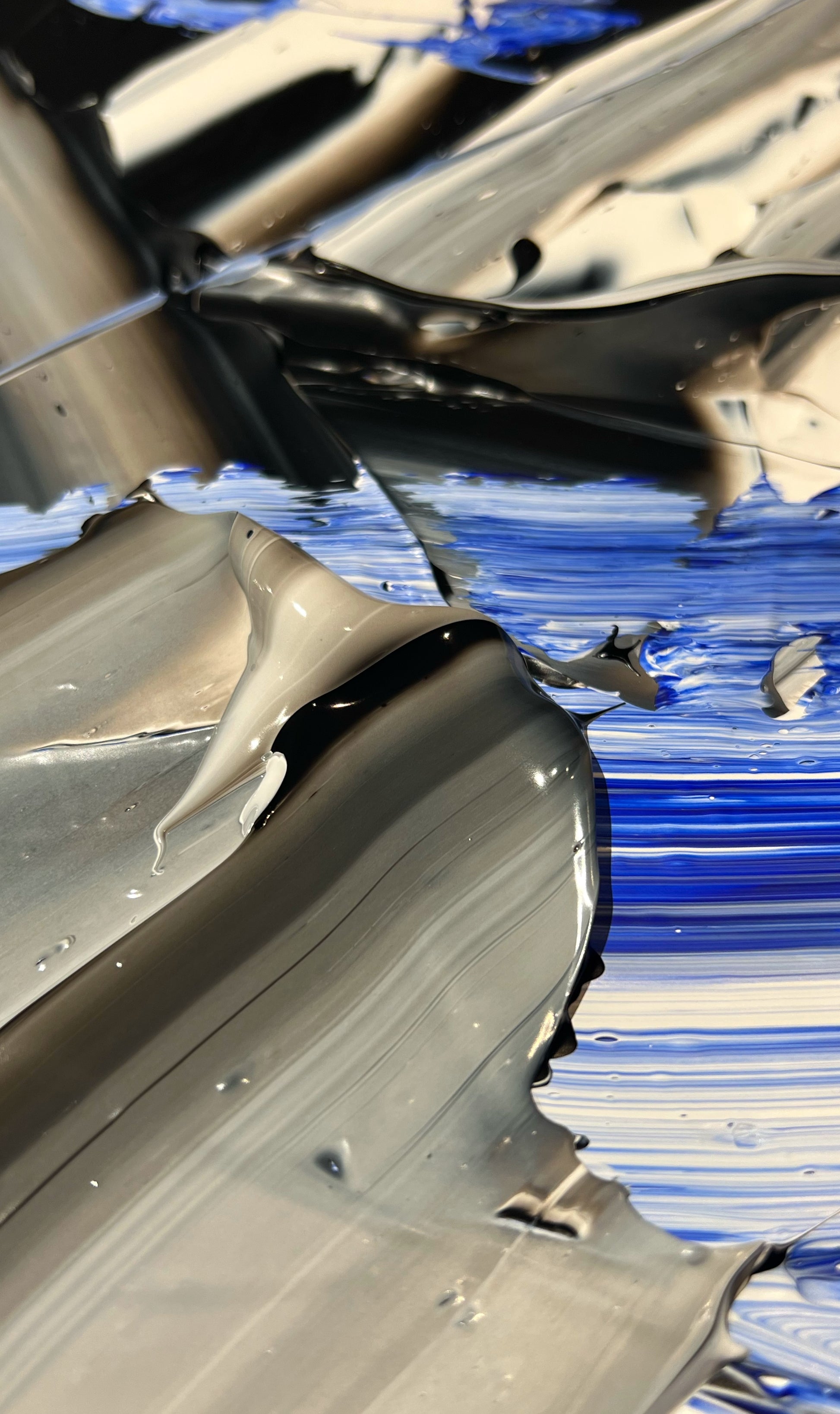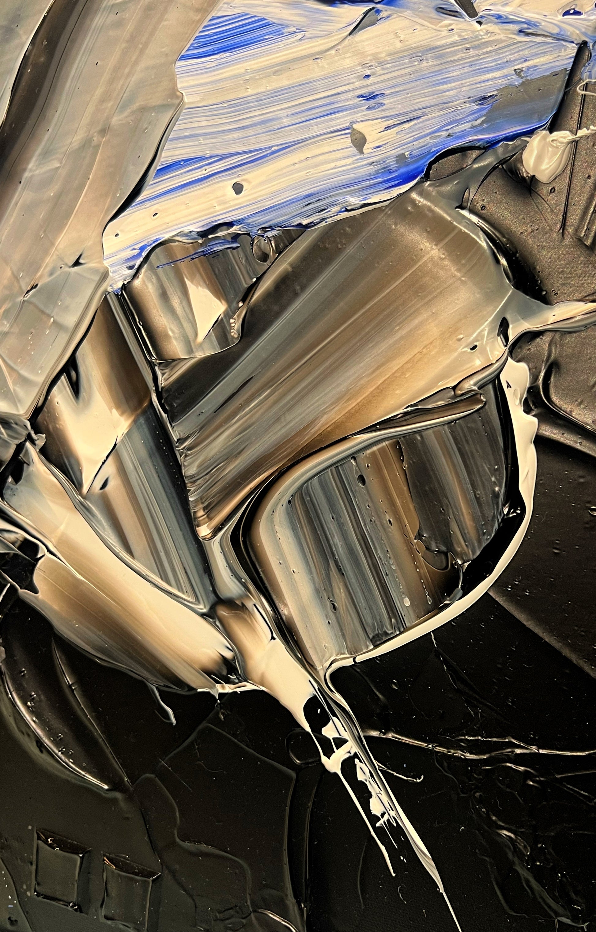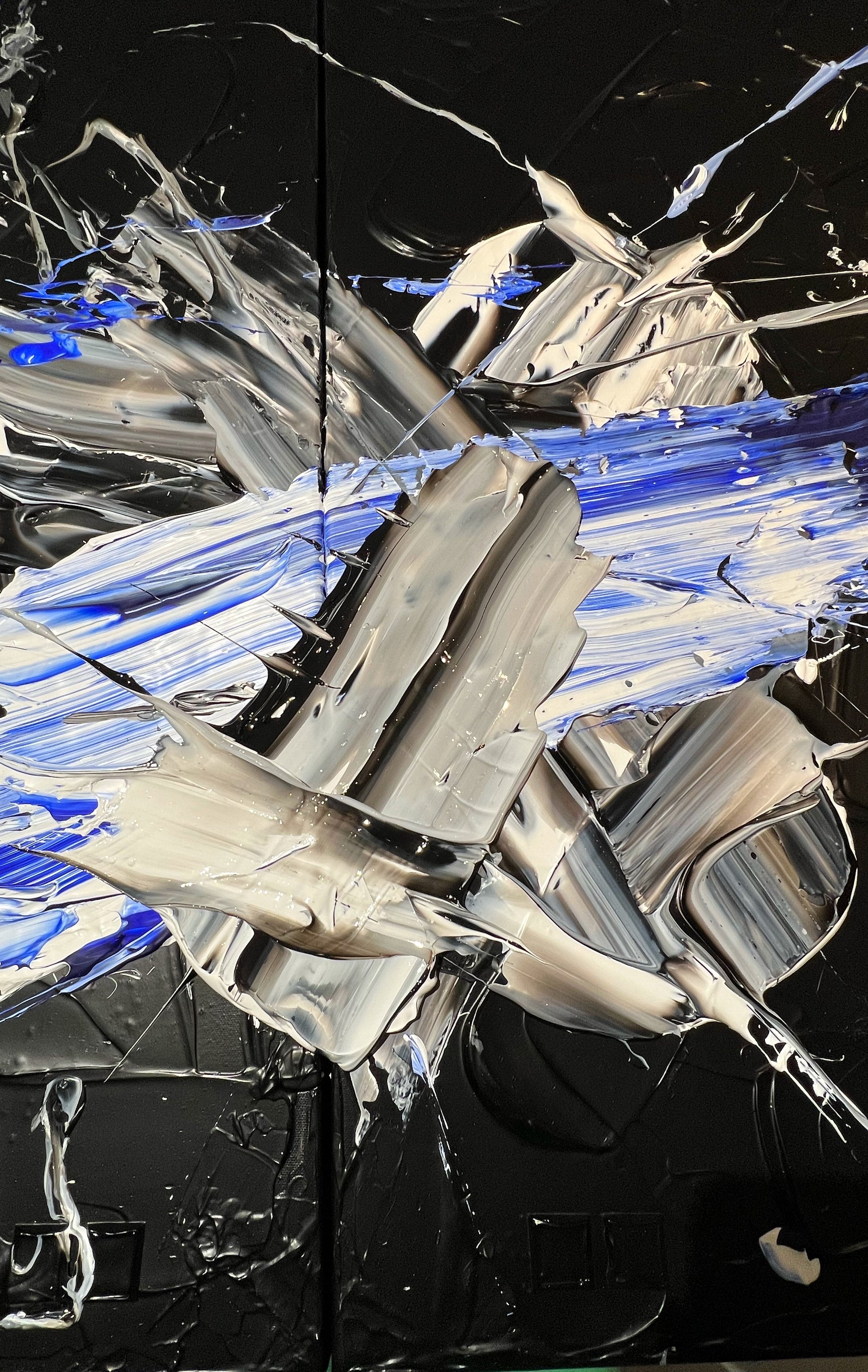 Chaque geste, chaque couche, chaque contraste révèle une énergie. Chaque mouvement génère une surprise, un enchantement ! Créer c’est découvrir, rêver et interpréter. Ces superpositions de peinture, cette recherche permanente d’un équilibre fragile, ces apparitions de formes et de couleurs inattendues me bouleversent lors de la création ! Des larmes coulent et le bonheur m’envahit