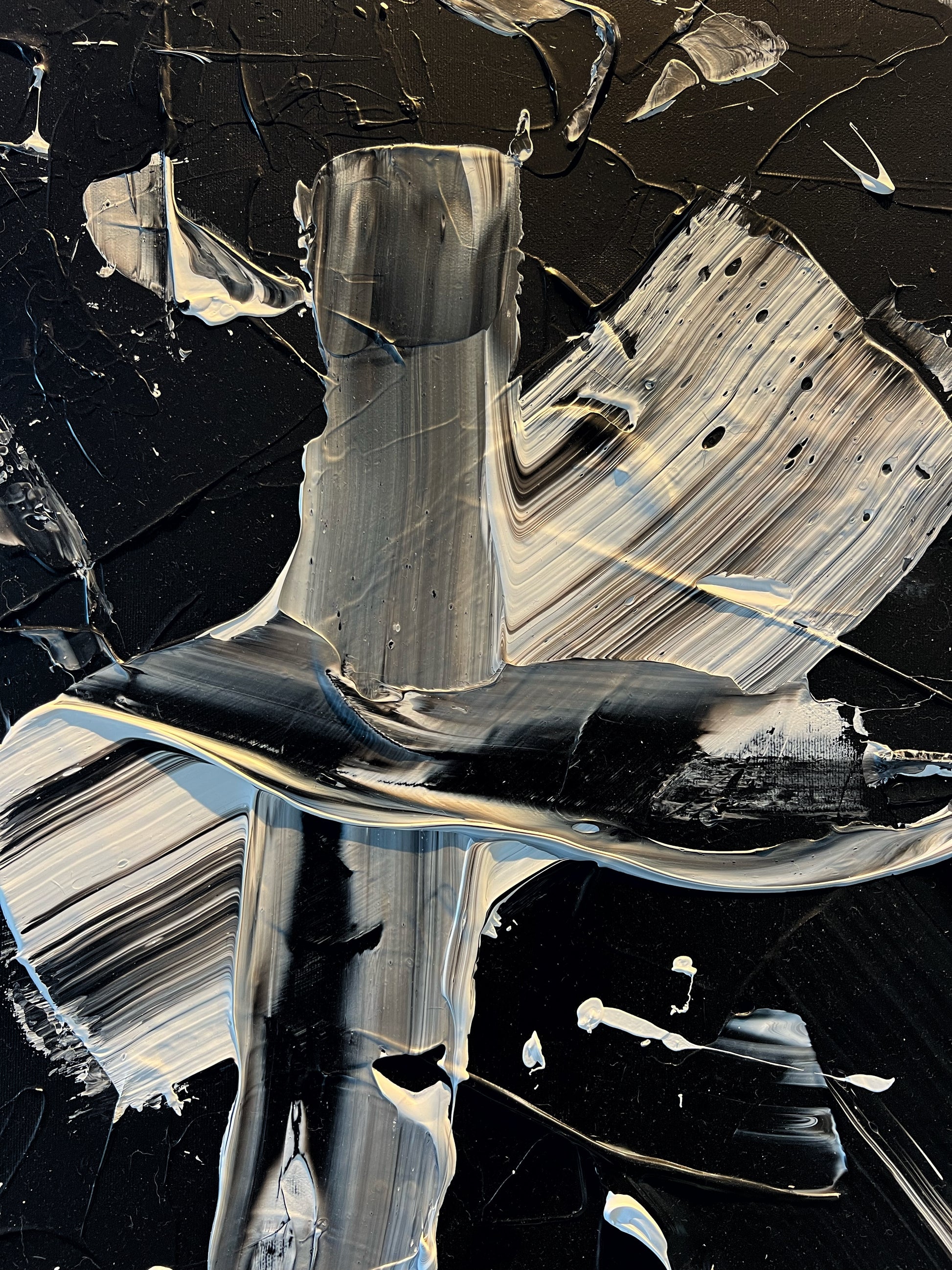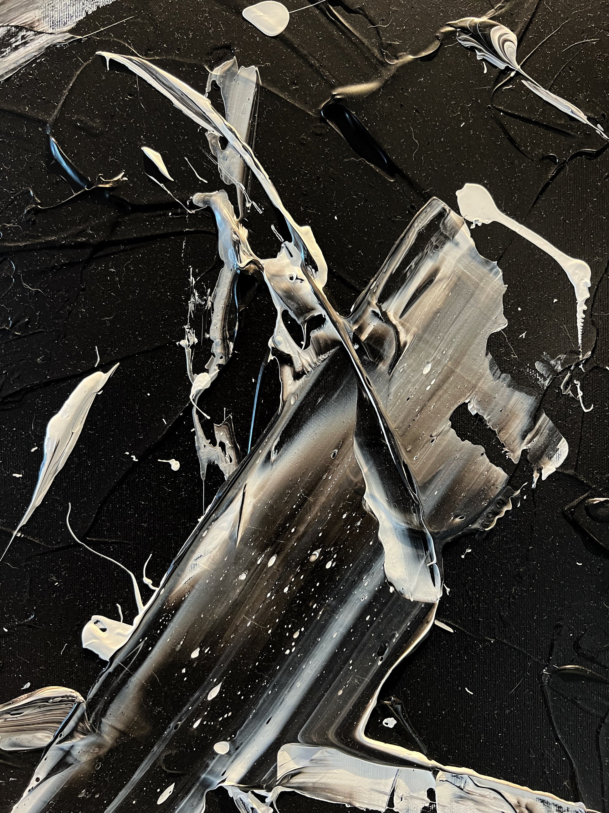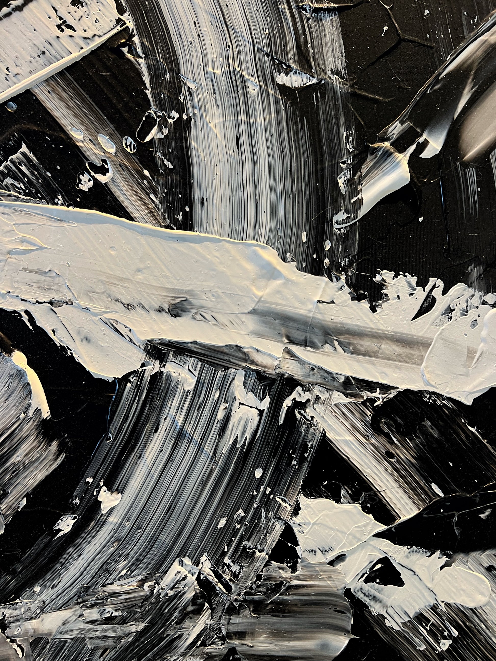 Chaque geste, chaque couche, chaque contraste révèle une énergie. Chaque mouvement génère une surprise, un enchantement ! Créer c’est découvrir, rêver et interpréter. Ces superpositions de peinture, cette recherche permanente d’un équilibre fragile, ces apparitions de formes et de couleurs inattendues me bouleversent lors de la création ! Des larmes coulent et le bonheur m’envahit